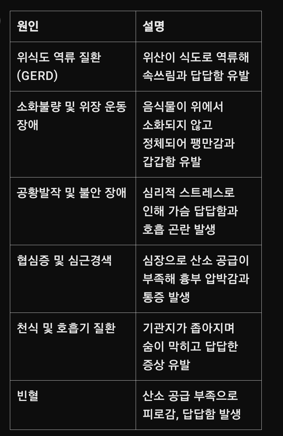 (1) 공황발작 및 불안 장애 심리적 스트레스나 공황 상태는 흉부 압박감과 함께 속이 갑갑한 증상을 유발합니다.