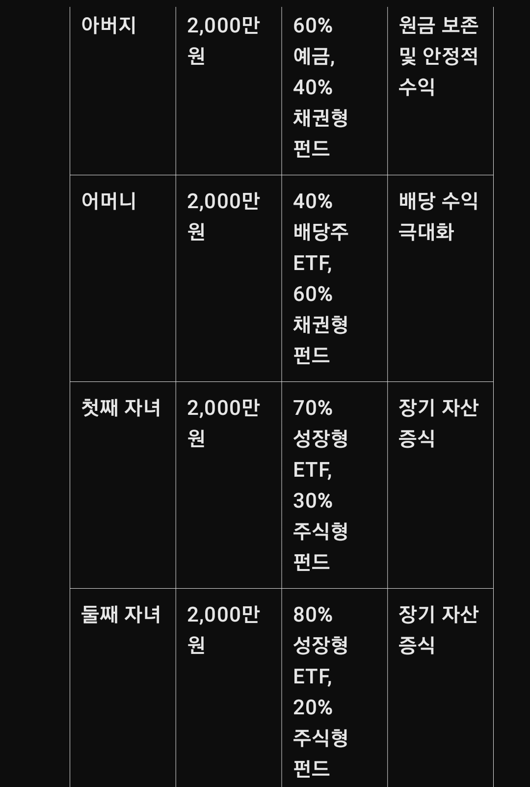 자녀: 성장형 투자(주식형 펀드, ETF).