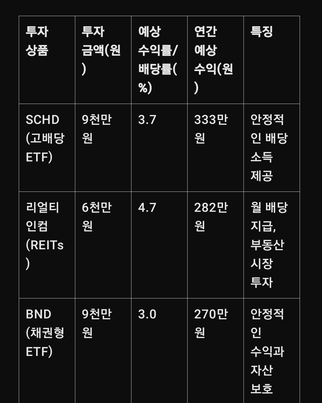 퇴직금 3억 원을 기준으로 포트폴리오를 구성하면 다음과 같습니다.