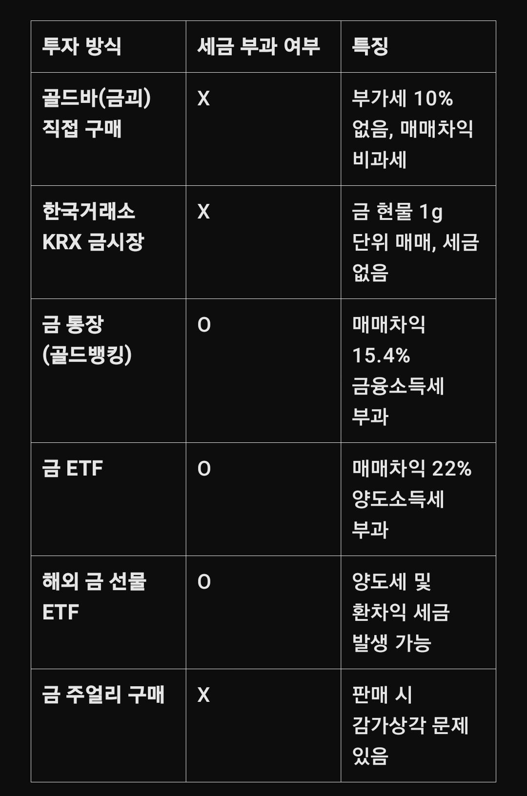✔ 금 투자 방식에 따라 세금 부과 여부가 다름