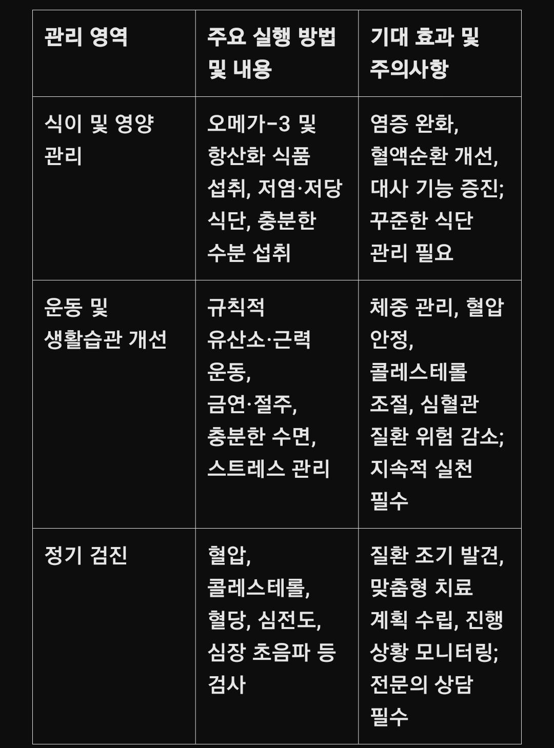 균형 잡힌 식이요법, 규칙적인 운동, 금연·절주, 충분한 수면, 스트레스 관리, 그리고 정기 검진 등 통합적 관리 전략은 단기적인 효과보다는 장기적이고 꾸준한 실천이 필수적입니다.