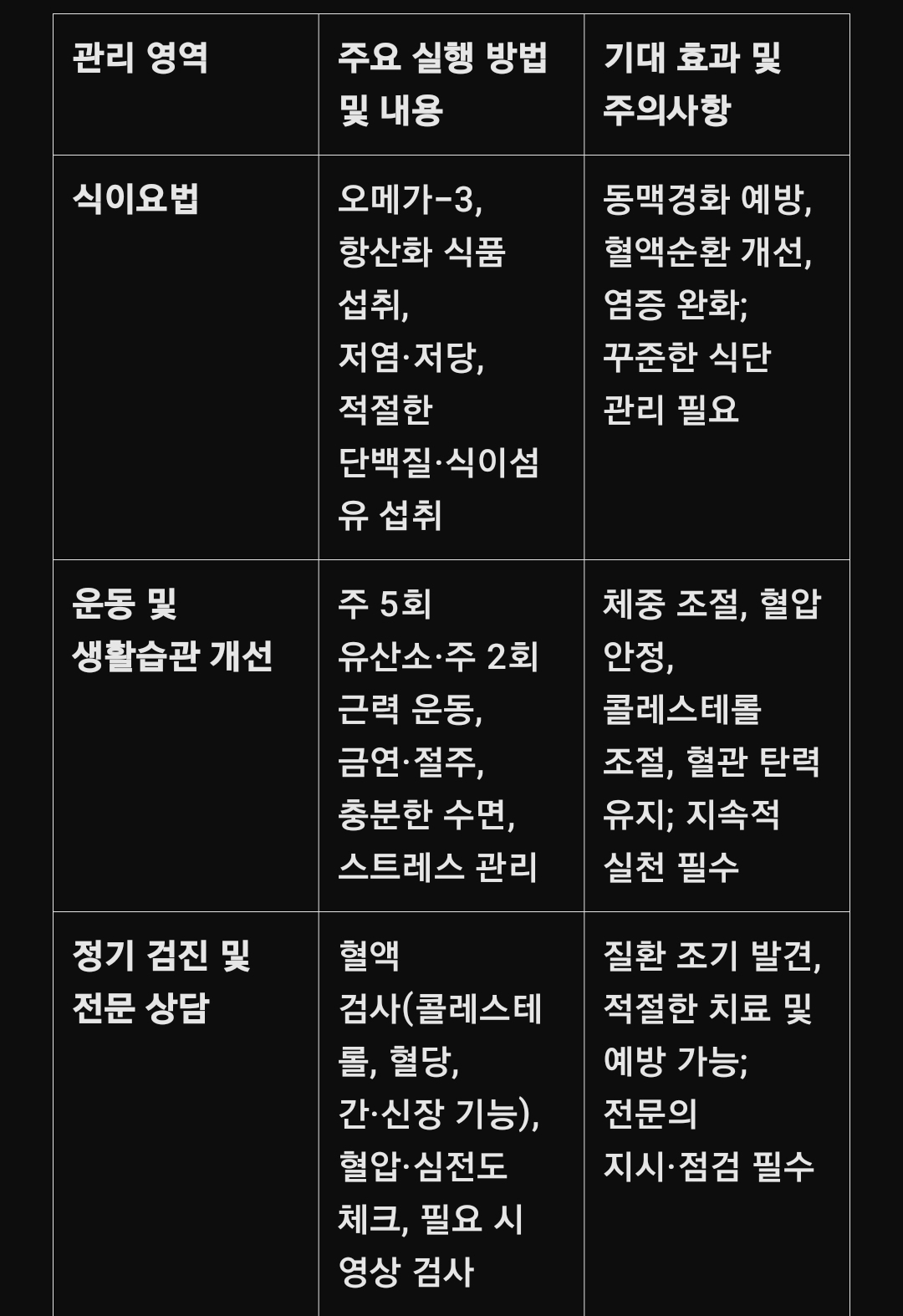 > 주의: 본 자료는 혈관 건강과 관련된 일반적인 정보 및 권장 가이드라인을 제공하기 위한 것으로, 개인의 건강 상태, 유전적 요인, 기저 질환, 생활습관 등에 따라 혈관 건강 유지 및 질환 예방을 위한 구체적인 방법은 달라질 수 있습니다. 증상이 나타나거나 건강 상태에 변화가 감지되면 반드시 전문 의료진(내과, 심장내과, 영양사 등)과 상담하시기 바랍니다.