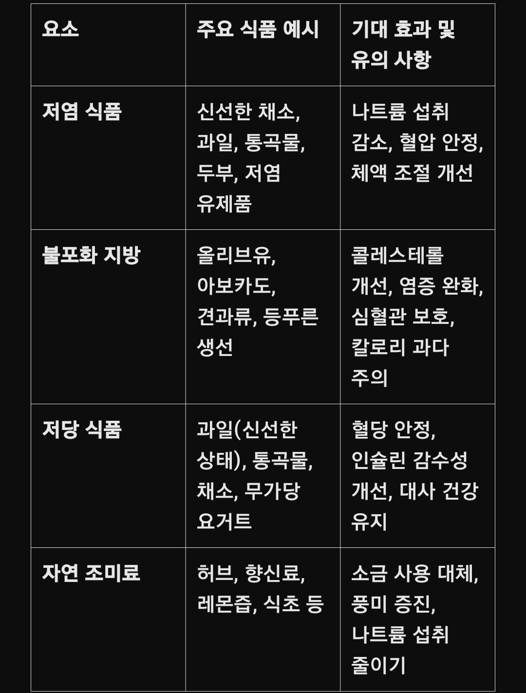 5. 첫 번째 표 – “저염식 식단 구성의 주요 요소 및 효과 요약”