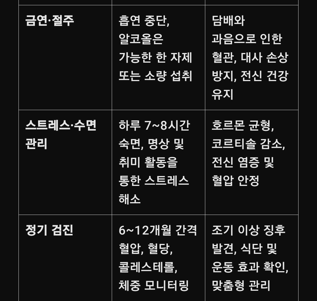 충분한 수면: 7~8시간의 양질의 수면은 호르몬 균형을 유지하여 혈압과 대사 건강에 긍정적인 효과를 줍니다.