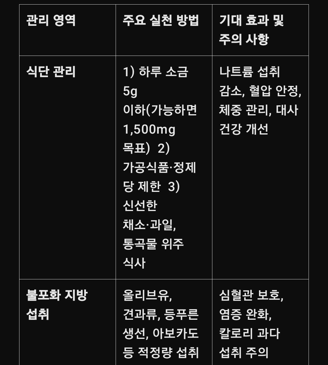 따라서 독자분들께서는 본 글을 참고하여, 매일의 식단에서 가공식품과 소금, 당류 섭취를 줄이고, 신선한 채소·과일, 통곡물, 불포화 지방이 풍부한 식품을 중심으로 한 저염·저당 식단을 실천해 보시길 권장합니다. 정기 검진과 자가 모니터링을 병행하며, 생활습관 전반을 개선함으로써 건강한 심혈관과 대사 상태를 유지하시기 바랍니다.