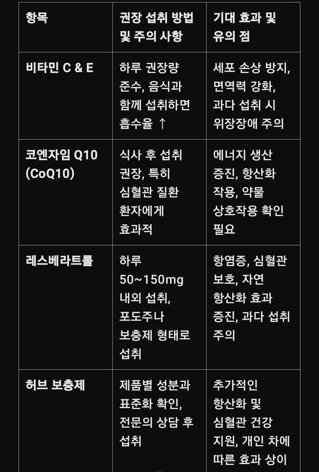 2. 항산화 보충제는 식품 보조 수단으로 활용하며, 무리한 고용량 섭취는 오히려 부작용을 초래할 수 있으므로, 반드시 전문의나 영양사와 상담 후 복용하시기 바랍니다.