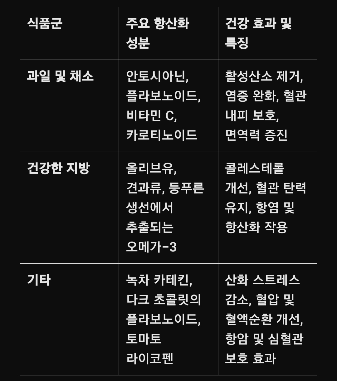 5. 첫 번째 표 – “심혈관 건강에 도움이 되는 항산화 식품 요약”