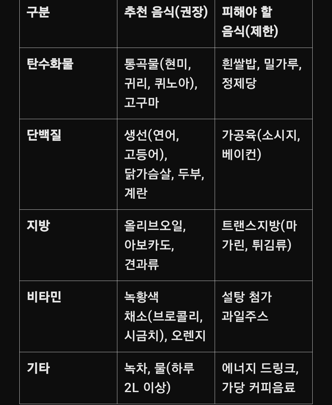 - 오메가-3(연어, 고등어) - 근력 운동 병행