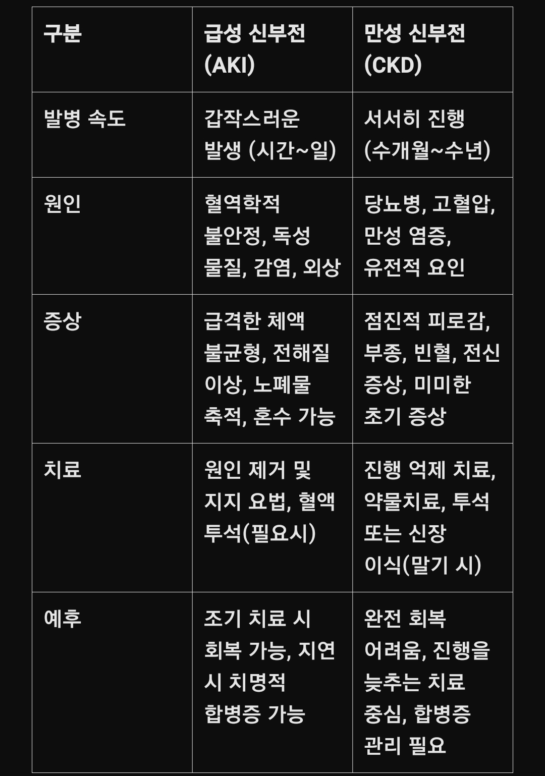 아래의 표는 급성 신부전과 만성 신부전의 차이점을 간단히 정리한 것이다.