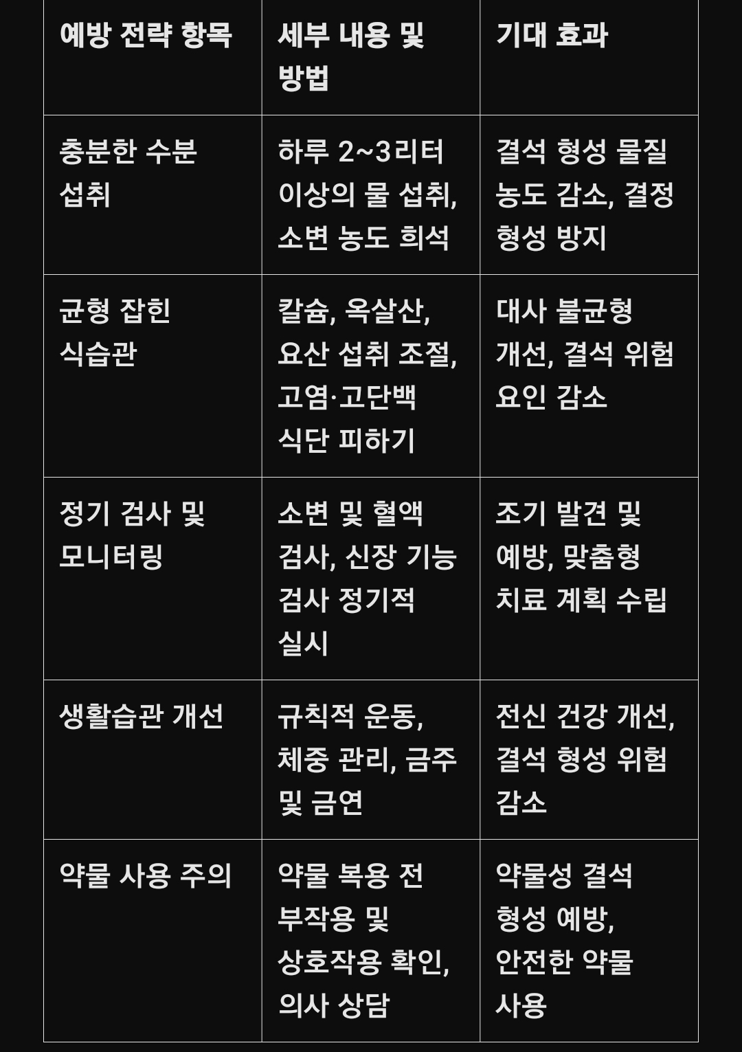 (표 형식 – 신장 결석 예방 전략 요약)