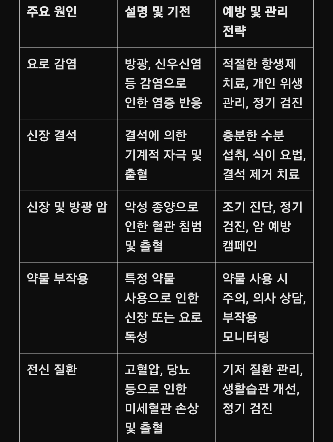 (표 형식 – 혈뇨의 주요 원인과 예방 관리 전략 요약)