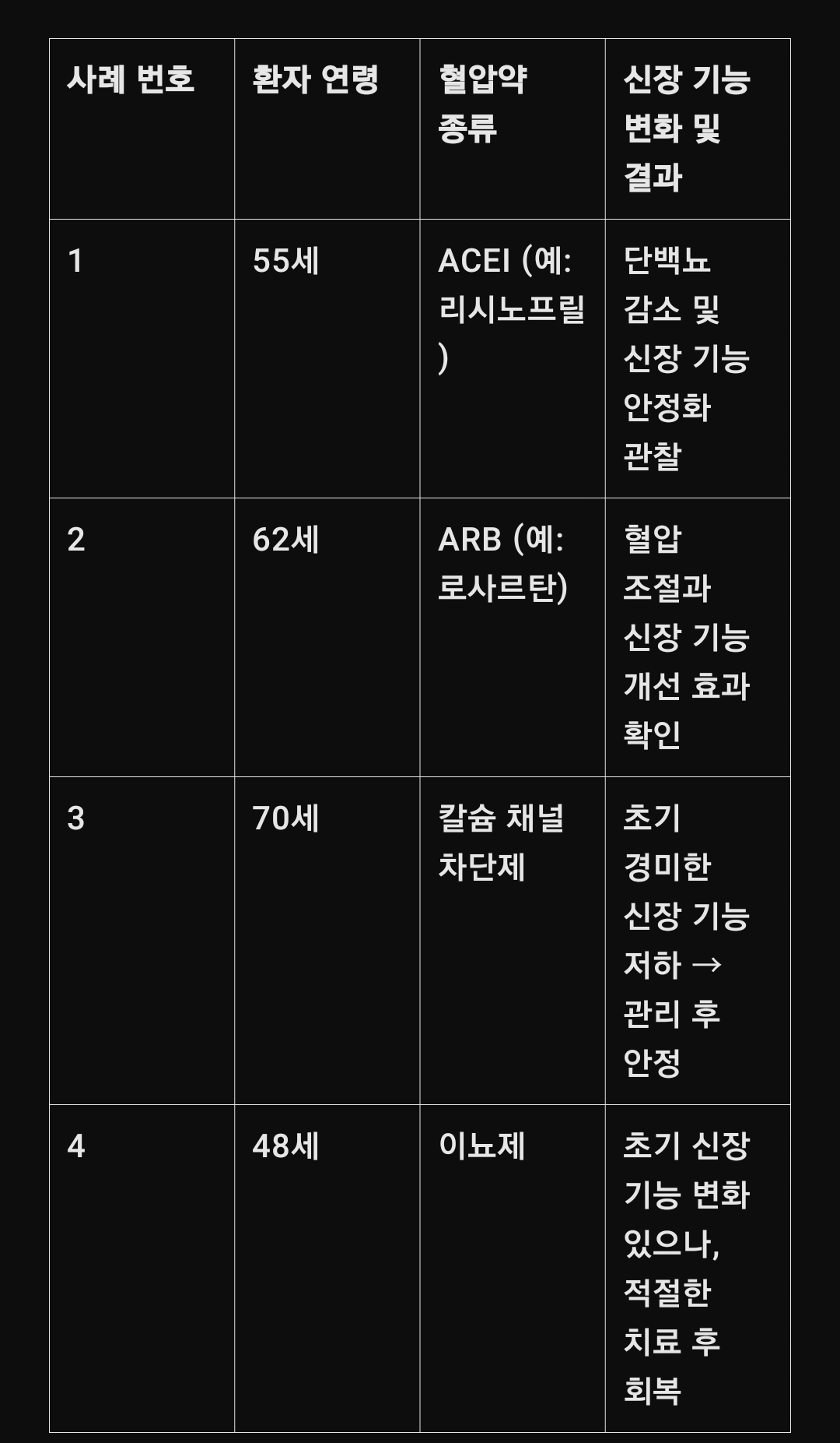 아래의 간단한 표는 실제 임상에서 관찰된 혈압약 복용과 신장 기능 변화에 관한 사례들을 정리한 것입니다.