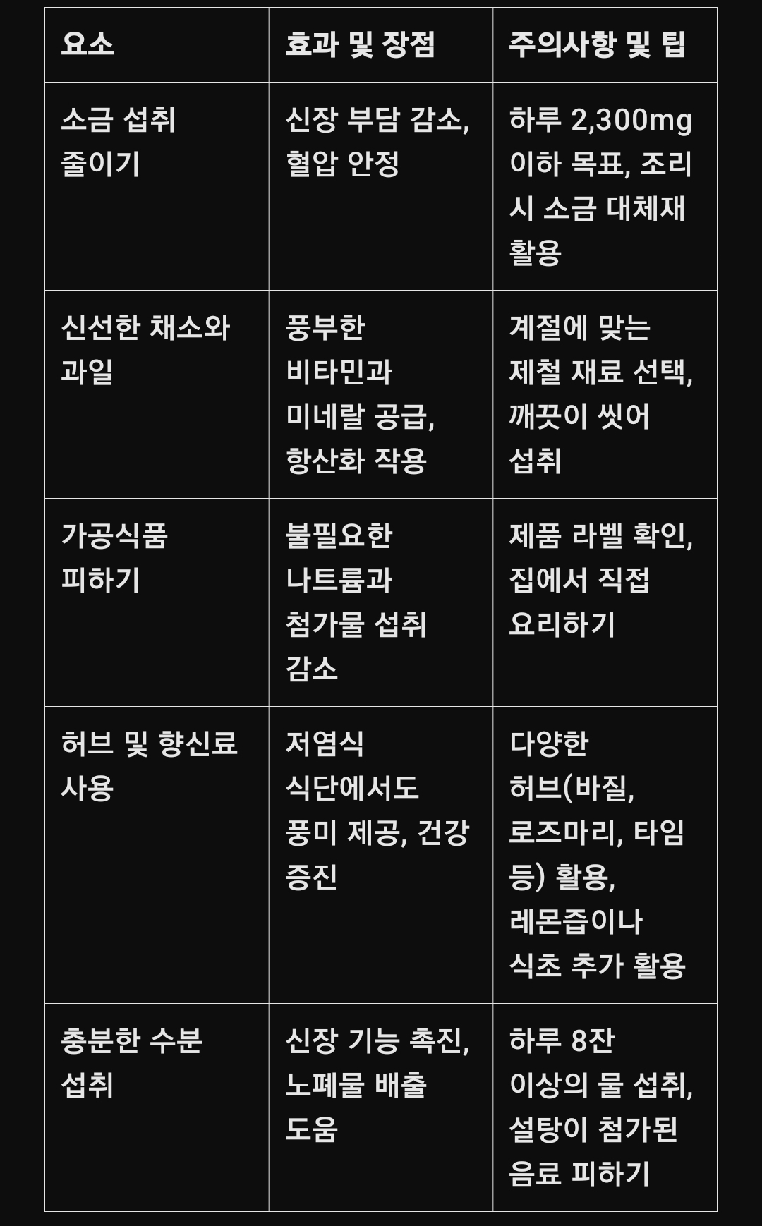 이 모든 내용을 한 번 정리해 보겠습니다. 신장은 우리 몸의 정수기와 같아서, 과도한 소금은 신장에 부담을 주고 혈압과 체액 균형에 문제를 일으킵니다. 저염식 식단은 신선한 채소, 과일, 통곡물, 허브, 향신료 등을 활용하여 소금 섭취를 줄이고, 신장이 부담 없이 원활하게 작동할 수 있도록 도와줍니다. 정기 검진과 생활 속 작은 실천들이 모이면, 평생 건강한 신장을 유지할 수 있답니다.