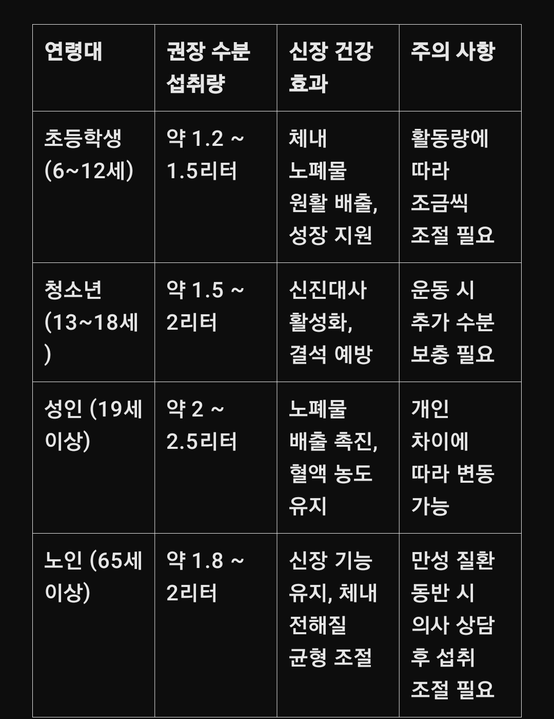 아래 표는 일반적인 연령대별 권장 수분 섭취량과 신장 건강에 미치는 긍정적 효과, 그리고 주의해야 할 사항을 정리한 것입니다.