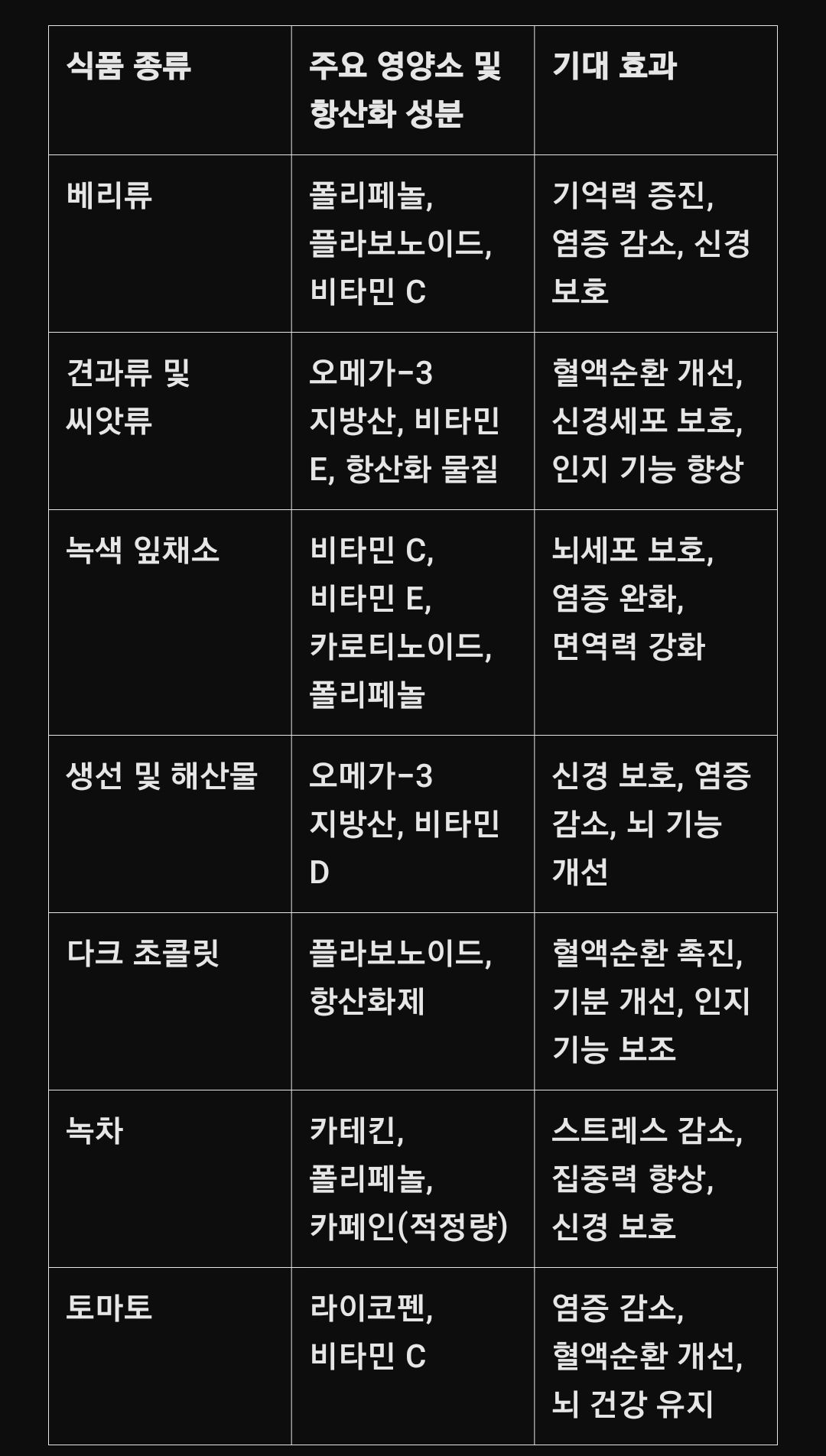 간단한 표: 뇌 건강에 좋은 항산화 식품과 주요 영양소