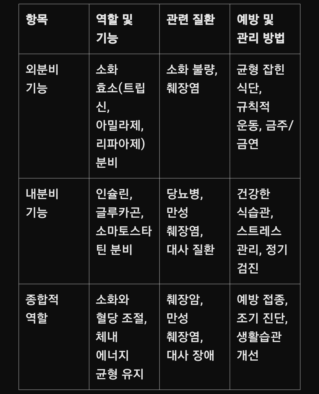 간단한 표: 췌장의 역할과 관련 질환 및 예방 방법