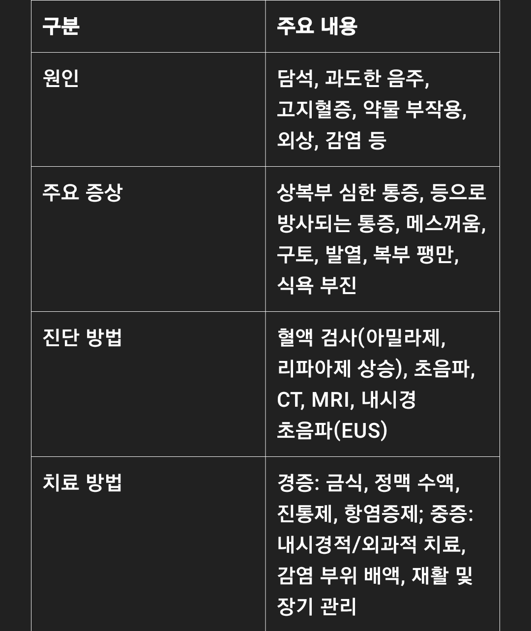 아래 표는 급성 췌장염의 주요 원인, 증상, 진단 방법, 그리고 치료법을 간략하게 정리한 내용입니다.