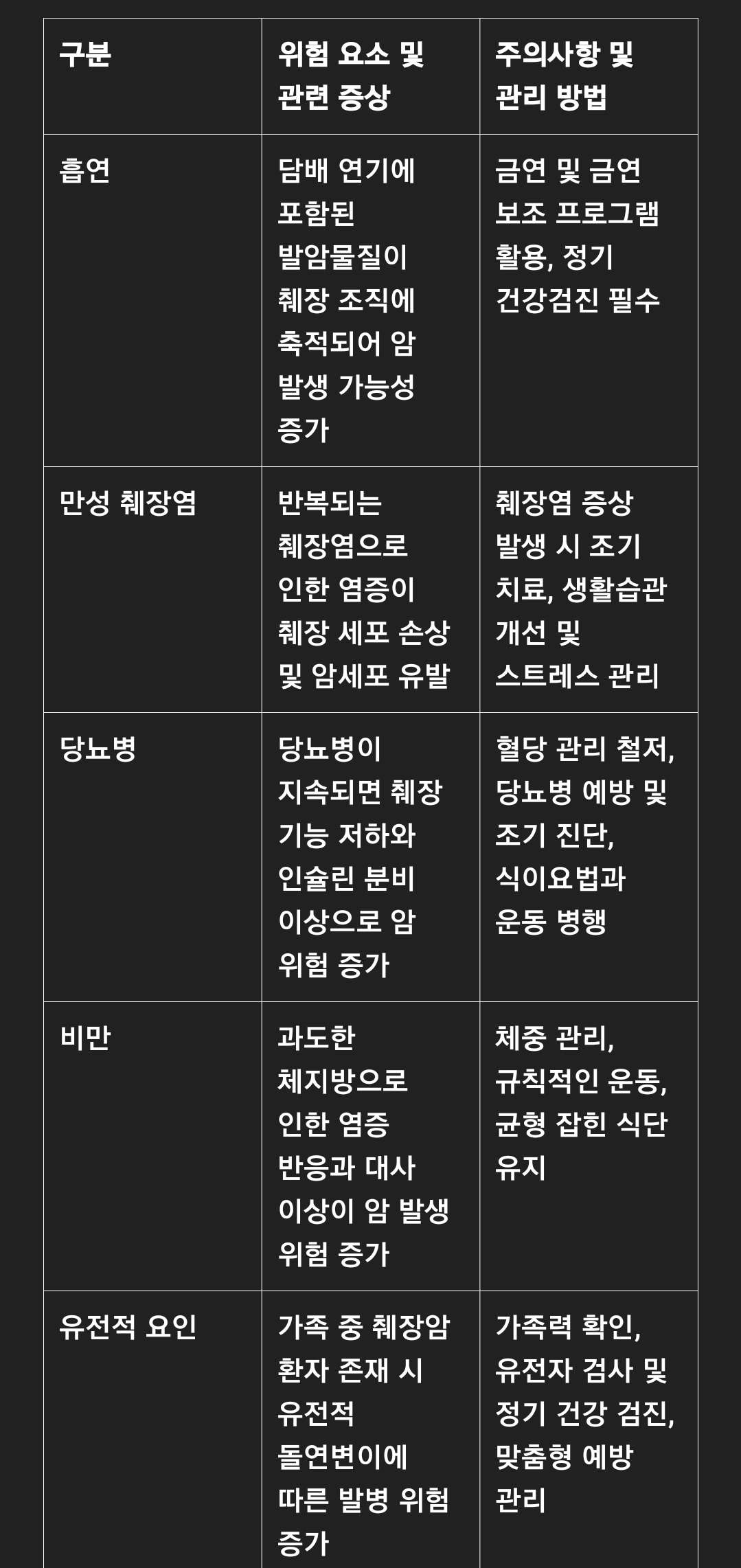 아래 표는 췌장암의 위험 요소와 관련 증상, 그리고 주의해야 할 점들을 간략히 정리한 것입니다.