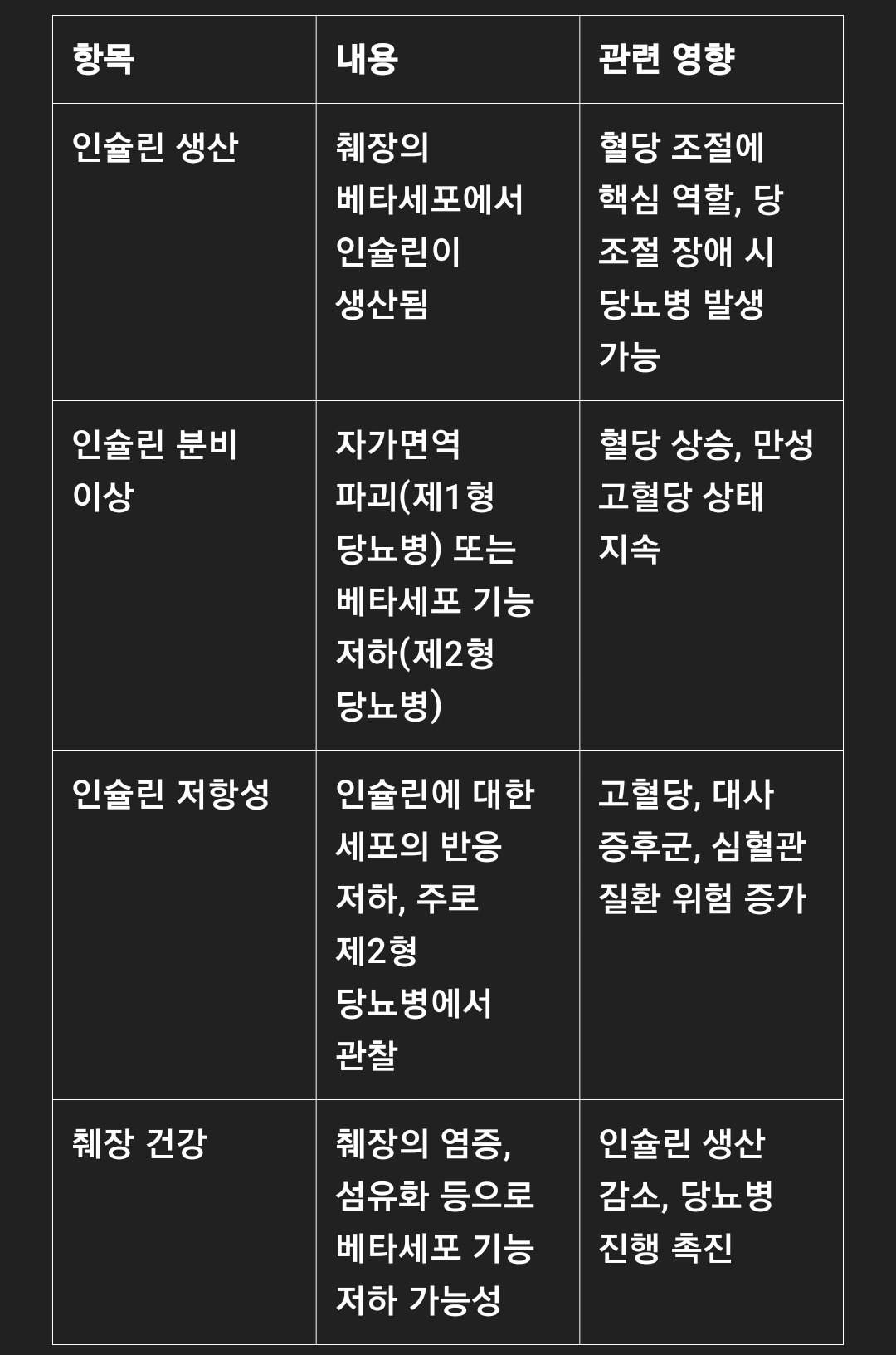 아래 표는 당뇨병과 췌장 기능, 특히 인슐린 생산과 관련된 주요 요소들을 간략하게 정리한 내용입니다.