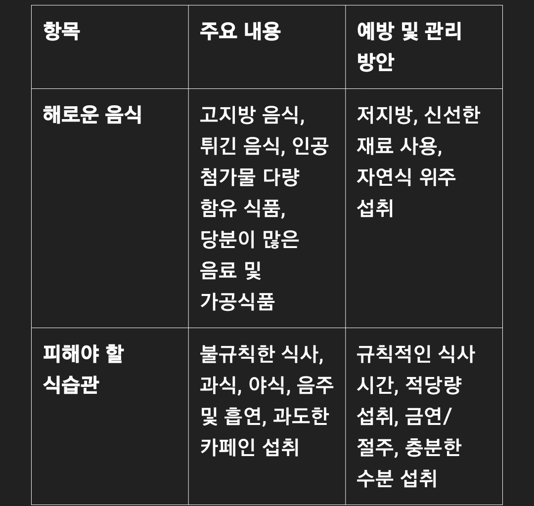 절주: 과도한 음주는 반드시 피하고, 음주 시에도 적당한 양을 유지합니다.