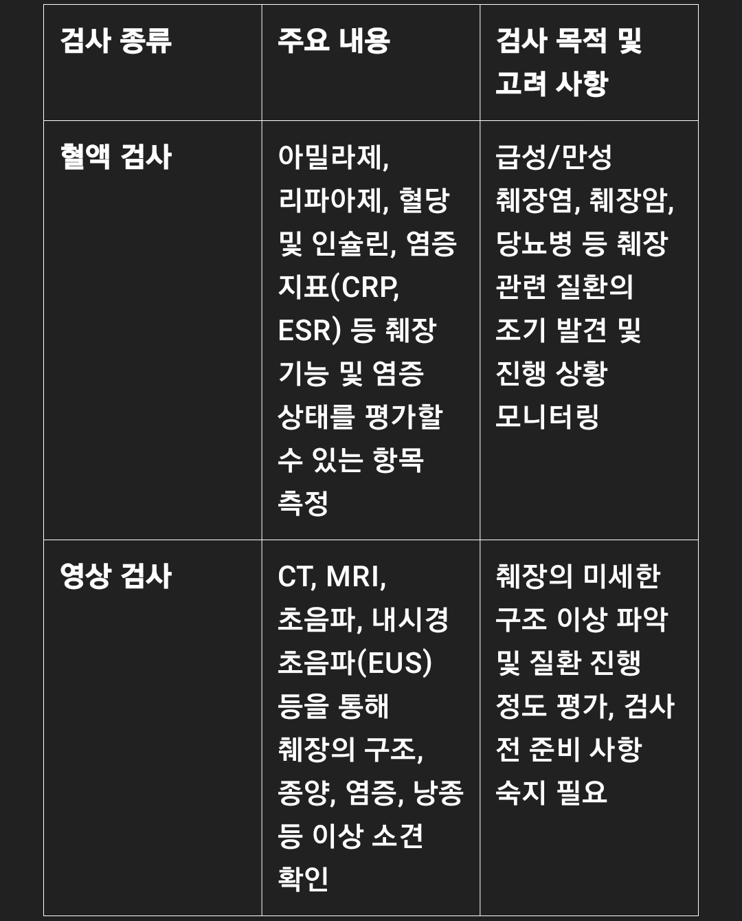 염증 지표 (CRP, ESR): 체내 염증 상태를 파악하는 데 사용되며, 만성 염증과 관련된 췌장 질환의 진행 정도를 평가합니다.