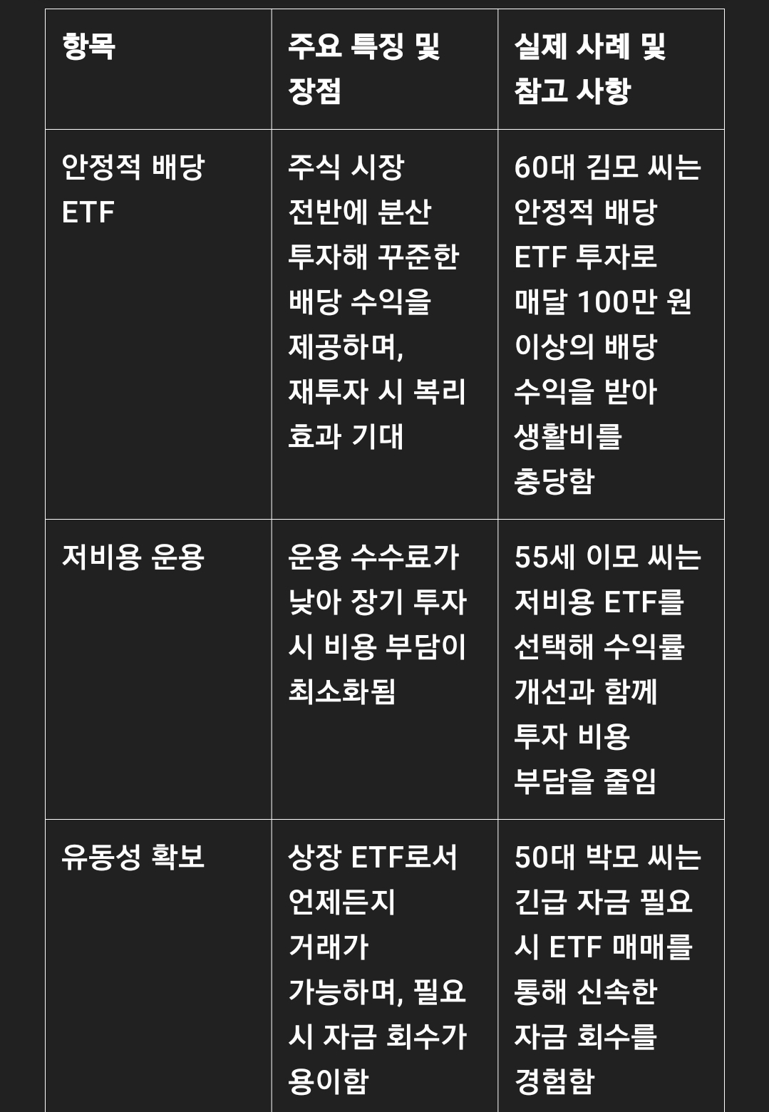 실제 사례로, 60대 김 모 씨는 은퇴 후 초기 투자금이 크지 않았음에도 불구하고, 배당 ETF에 투자하여 매월 100만 원 이상의 배당 수익을 받아 생활비를 충당하고, 이를 재투자하여 자산 증식을 도모하였습니다.