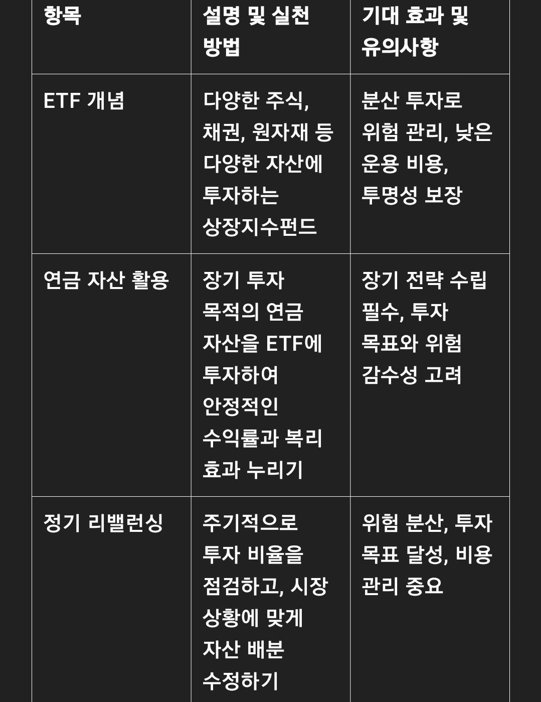 "장기적인 투자 전략을 갖고, 매월 또는 분기별로 적립식으로 투자하는 방법이 연금 준비에 있어 가장 효과적입니다. ETF의 비용 효율성과 분산 투자 효과를 최대한 활용하시길 바랍니다."