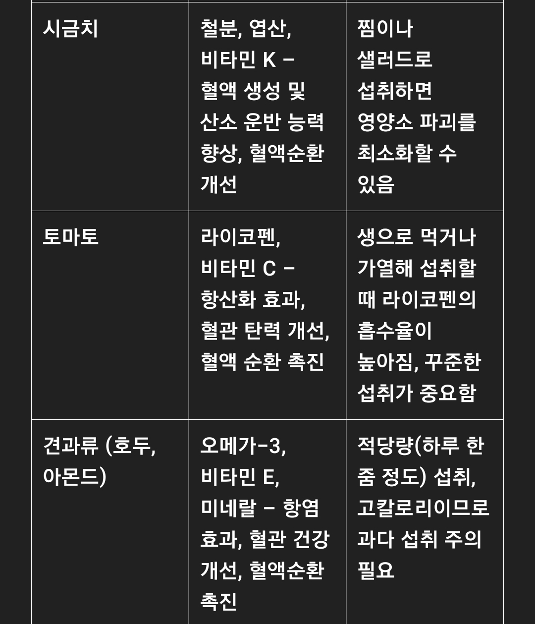"혈액순환을 개선하는 음식들은 대부분 항산화제가 풍부하고, 염증을 억제하는 성분을 함유하고 있습니다. 식단에 꾸준히 포함시키면 전신 건강은 물론, 노화 예방에도 큰 도움이 됩니다."
