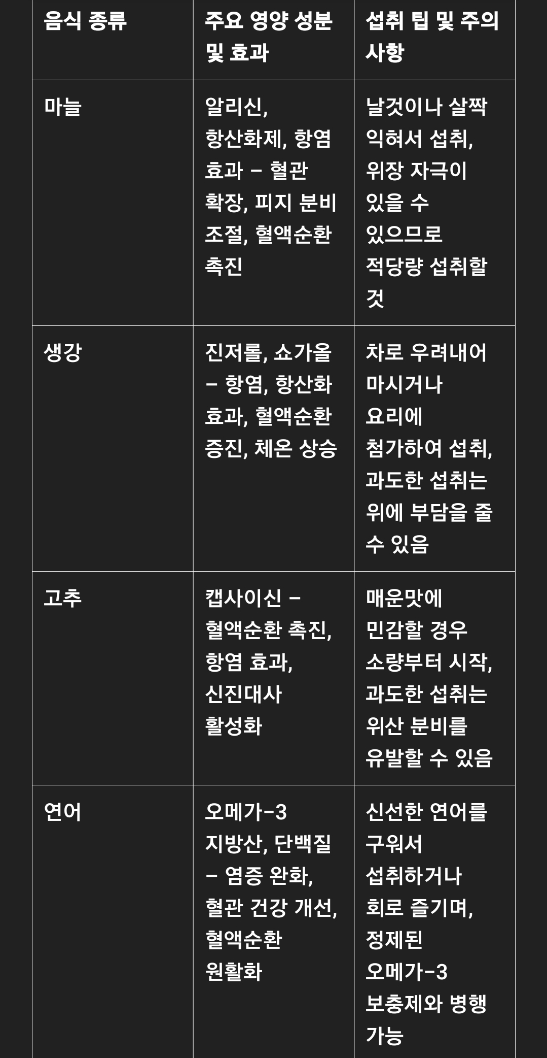 이 글을 통해 여러분께서 혈액순환을 개선하는 데 도움을 주는 음식들을 이해하고, 건강한 식습관을 통해 전반적인 신체 건강을 증진시키시길 바랍니다.