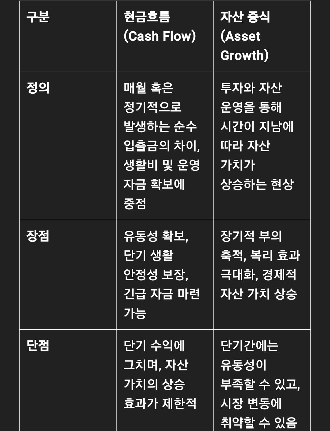 현금흐름과 자산 증식은 단기 생활의 안정과 장기적인 부의 축적을 위한 두 가지 중요한 재정 목표입니다.
