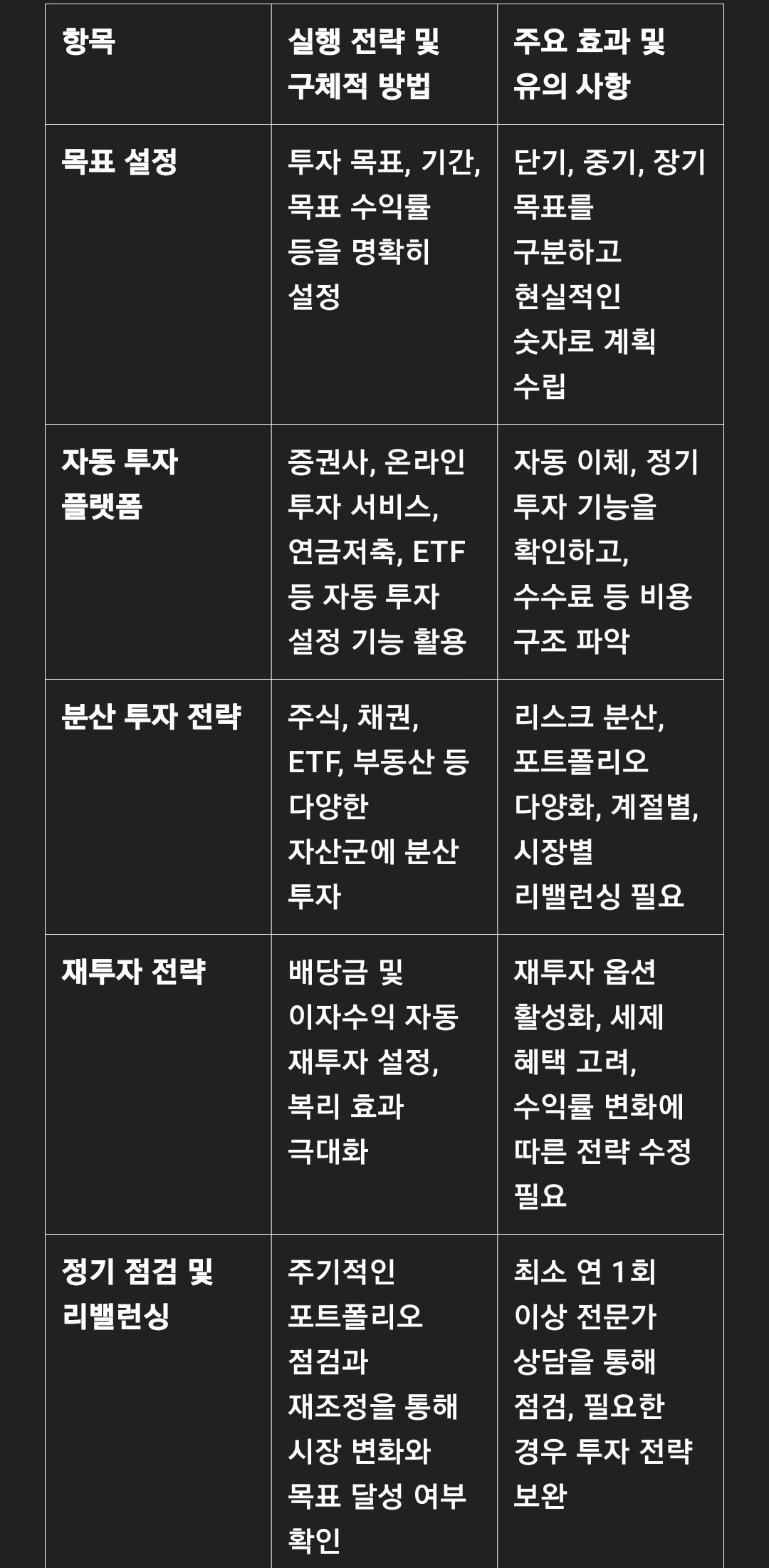 본 글에서는 투자 목표 설정, 자동 투자 플랫폼 선택, 분산 투자와 재투자 전략, 소비 및 저축 관리, 정기 재정 점검 및 전문가 상담 등 전 과정을 자세히 설명드렸습니다.