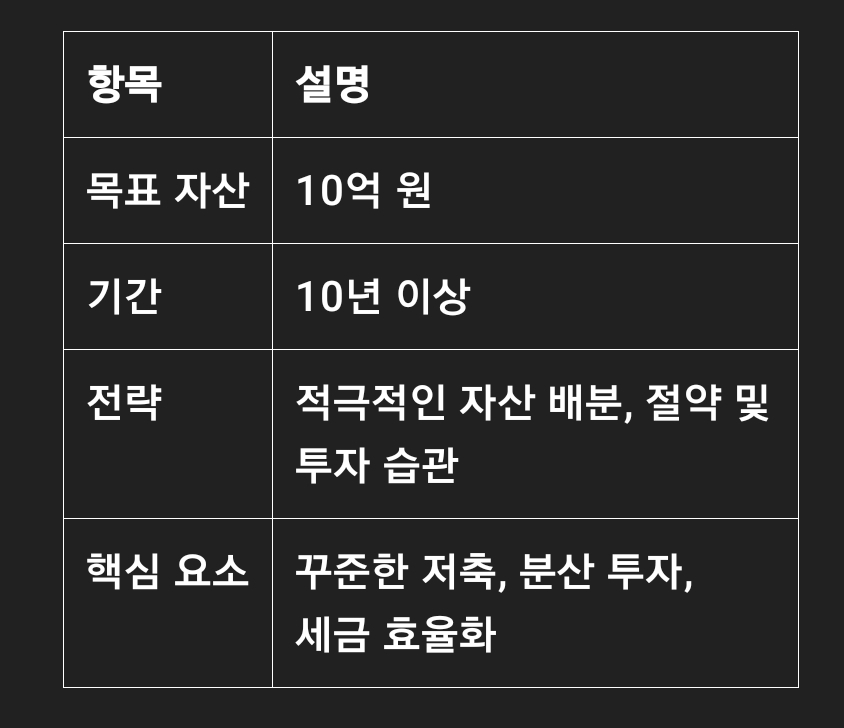 월급쟁이로서 10억 원 자산을 달성하는 것은 단기적인 목표가 아니지만, 체계적인 자산 설계와 꾸준한 노력을 통해 충분히 달성할 수 있습니다. 저축과 분산 투자를 통해 안정적이고 지속적인 자산 증식을 실현할 수 있습니다. 또한, 세금 효율적인 관리와 장기 투자 전략을 활용하면 단기간에 고수익을 추구하기보다, 안정적인 재정 관리를 통해 10억 원 자산을 쌓을 수 있습니다.