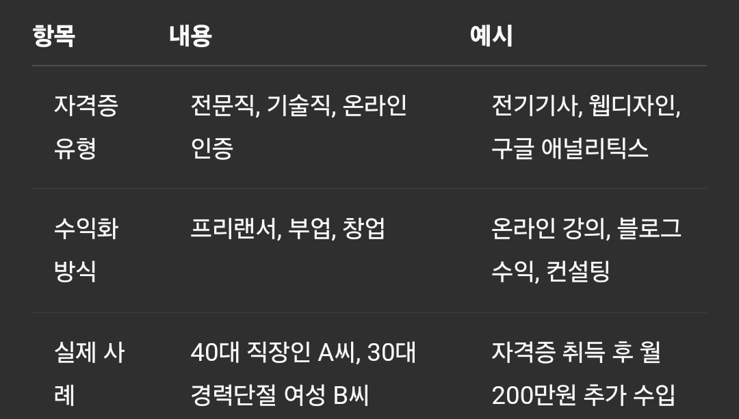 이처럼 자격증과 기술은 나이, 성별, 전공과 상관없이 누구나 새로운 수익의 문을 열 수 있는 열쇠가 됩니다. 특히 디지털 전환이 가속화된 시대에는 실무형 기술이 결합된 자격증이 더욱 큰 가치를 가집니다.