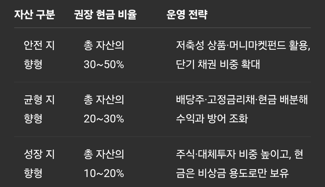 2. 균형 지향형 전략: 총 자산의 20~30% 현금 보유