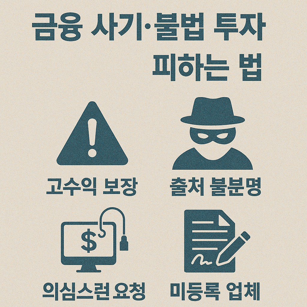 금융 사기와 불법 투자는 아무리 작은 유혹이라도 자산을 크게 위협합니다. 투자 전 반드시 금융당국 등록 여부와 수익 구조를 꼼꼼히 검증하고, 소액·분산 투자로 리스크를 최소화하세요. 의심 가는 제안은 전문가와 상의하거나, 즉시 공식 기관에 문의하시기 바랍니다.