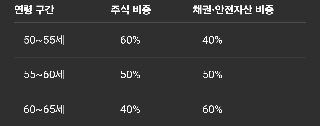 연령대별 자산 비중 조정: 성장 단계(5060세)→보호 단계(60~65세)