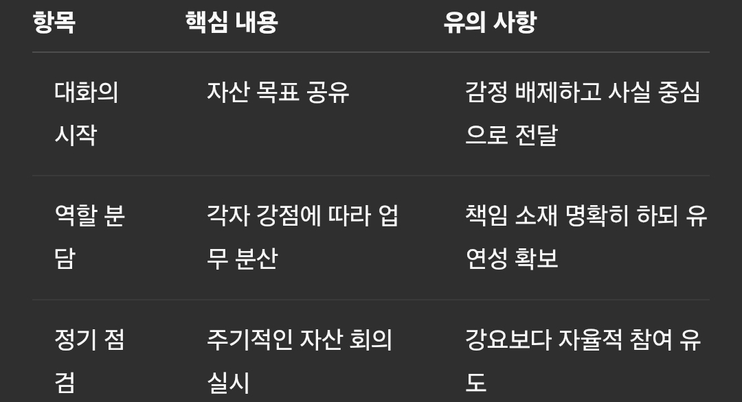 가족 단위로 자산을 관리하려면 역할 분담이 중요합니다. 누가 월급 관리를 할지, 누가 투자 결정을 할지, 누가 가계부를 정리할지 등에 대한 명확한 분담이 필요합니다. 이때 중요한 점은 '지속 가능한 방식'으로 업무를 분배하는 것입니다.