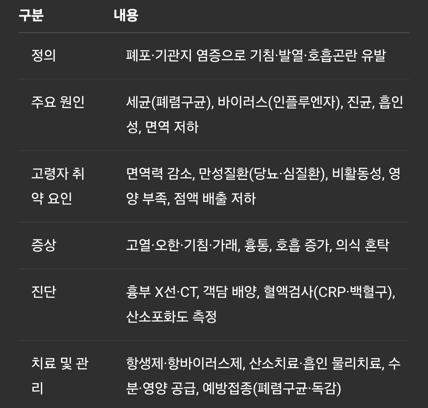 주요 원인 세균(폐렴구균), 바이러스(인플루엔자), 진균, 흡인성, 면역 저하