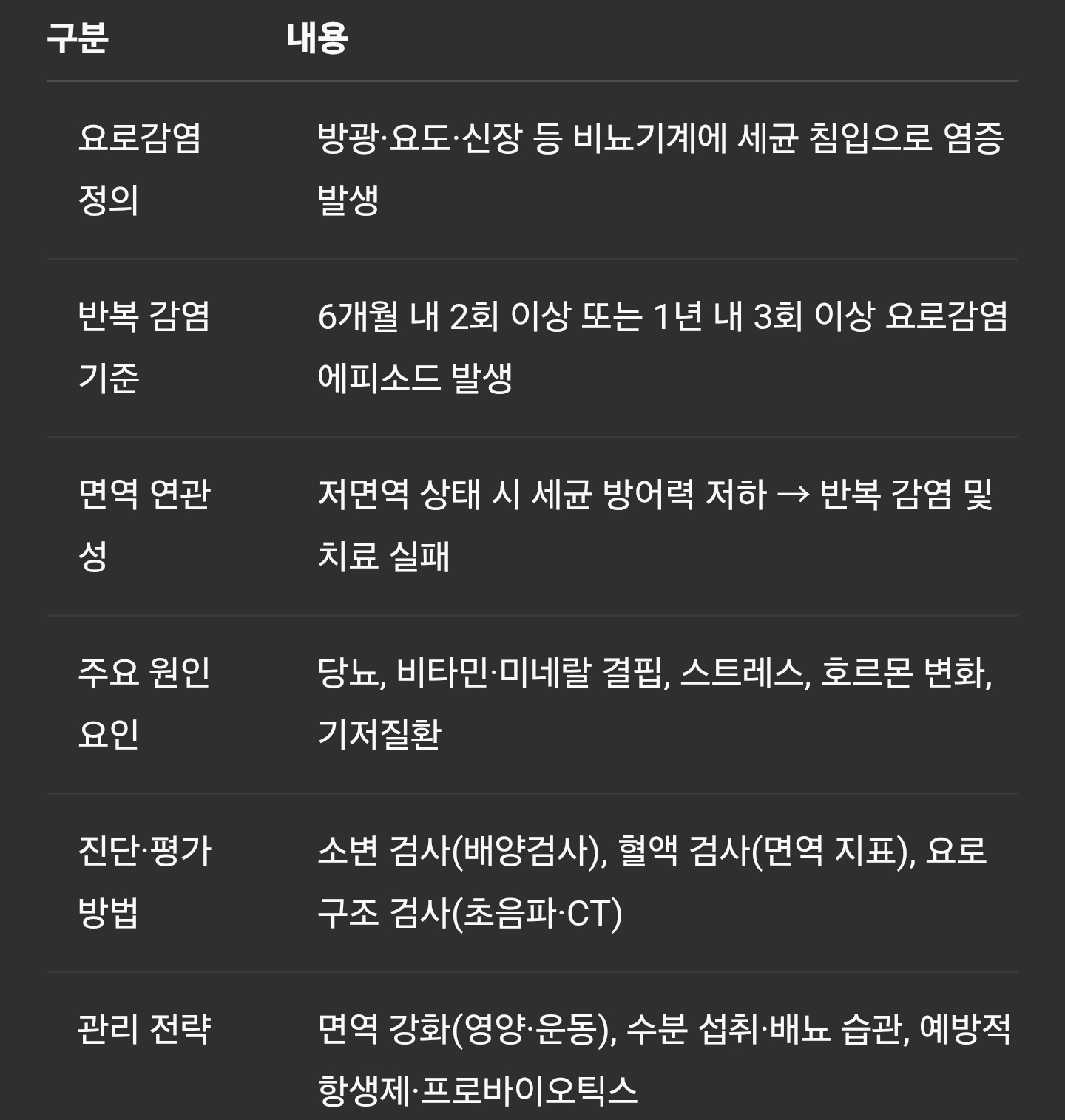 반복 요로감염은 단순히 항생제로 해결되는 문제가 아니라, 면역 체계와 기저질환이 복합적으로 관여합니다. 영양 보충, 수분·배뇨 습관 개선, 프로바이오틱스, 예방적 조치 등을 통해 점막 방어력을 높이고 장내·요로 미생물 균형을 유지해야 합니다.
