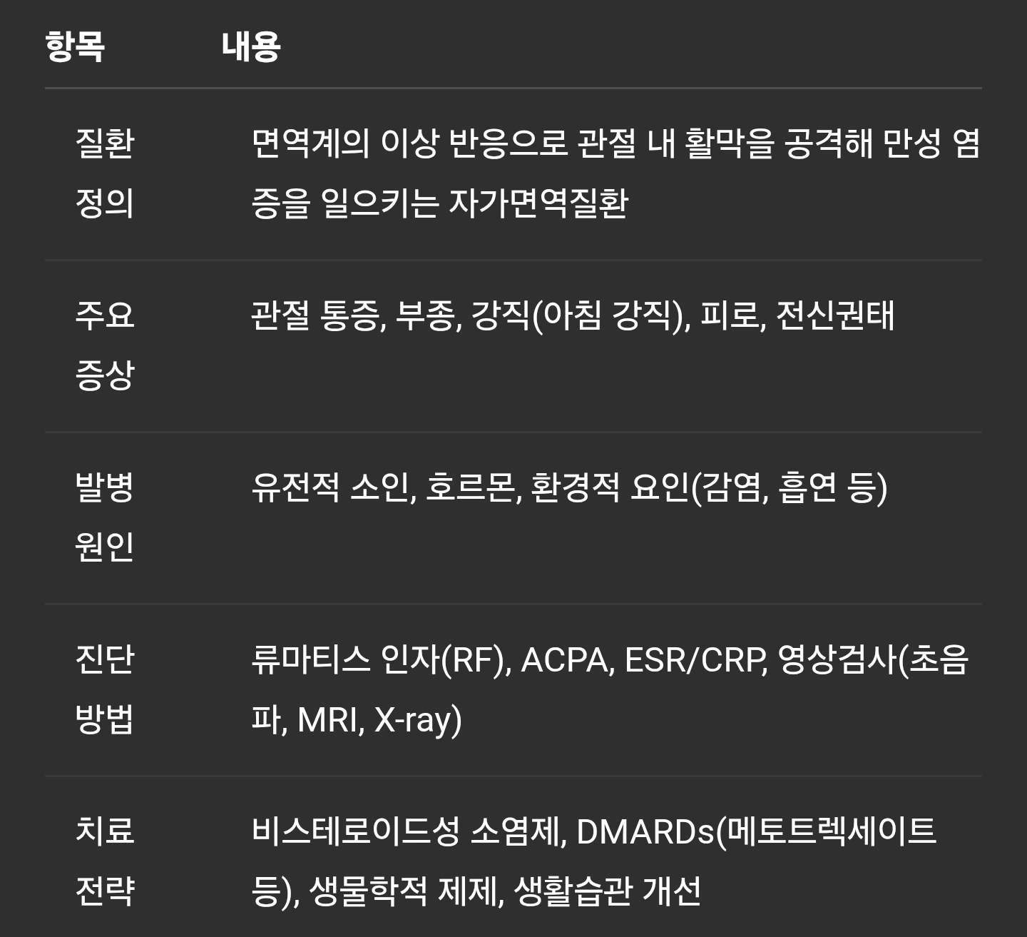 치료 전략 비스테로이드성 소염제, DMARDs(메토트렉세이트 등), 생물학적 제제, 생활습관 개선