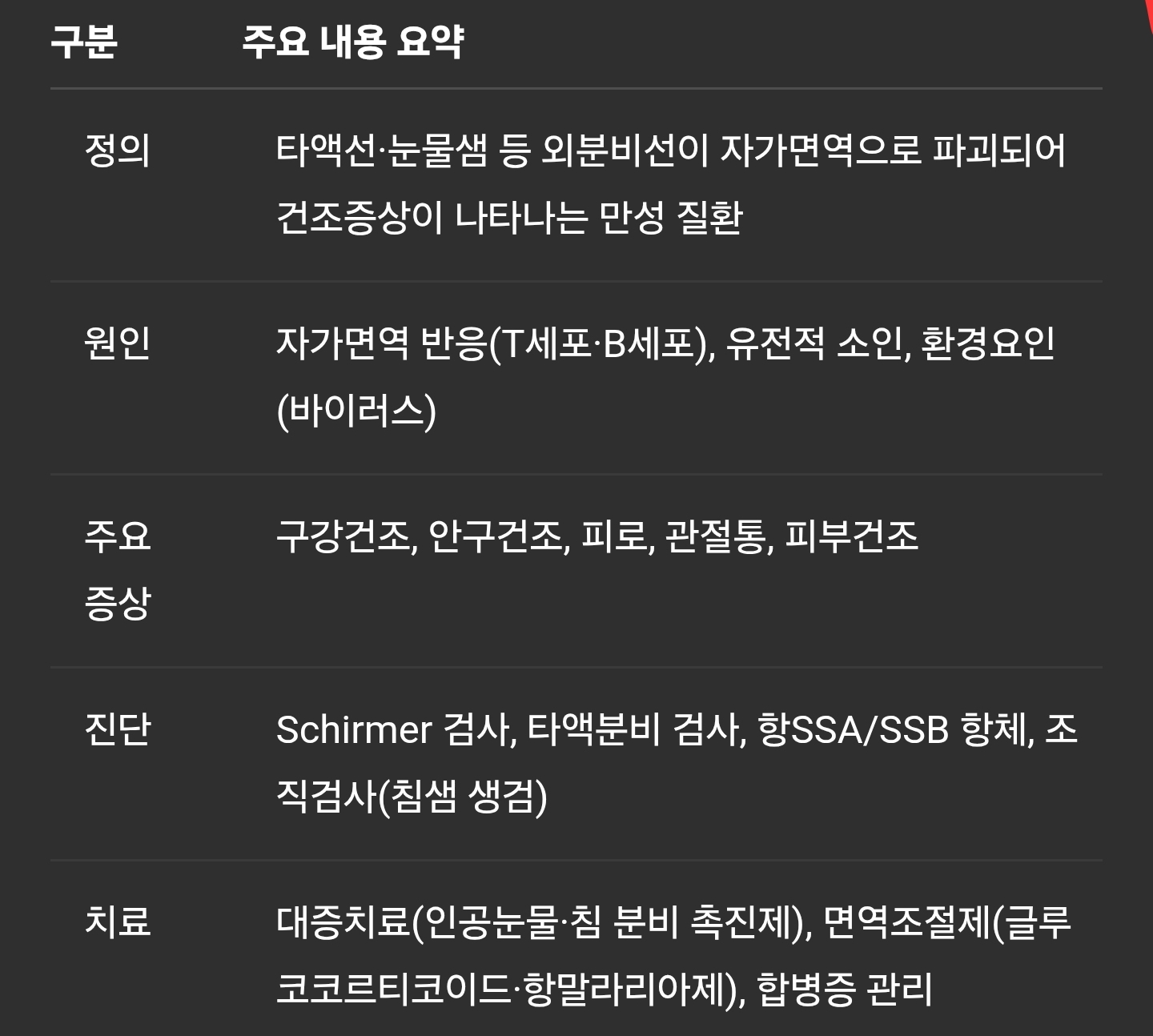 정의 타액선·눈물샘 등 외분비선이 자가면역으로 파괴되어 건조증상이 나타나는 만성 질환