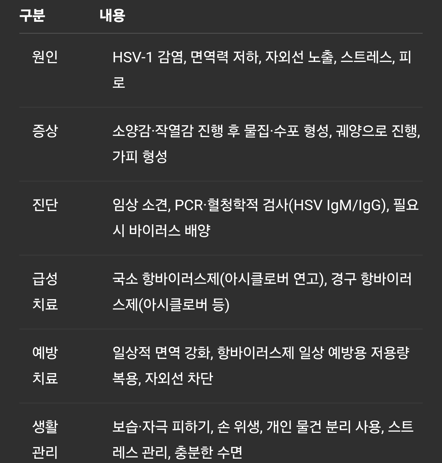 면역 저하(감기·스트레스·피로), 자외선 노출, 호르몬 변화 등이 재발 유발 요인입니다.