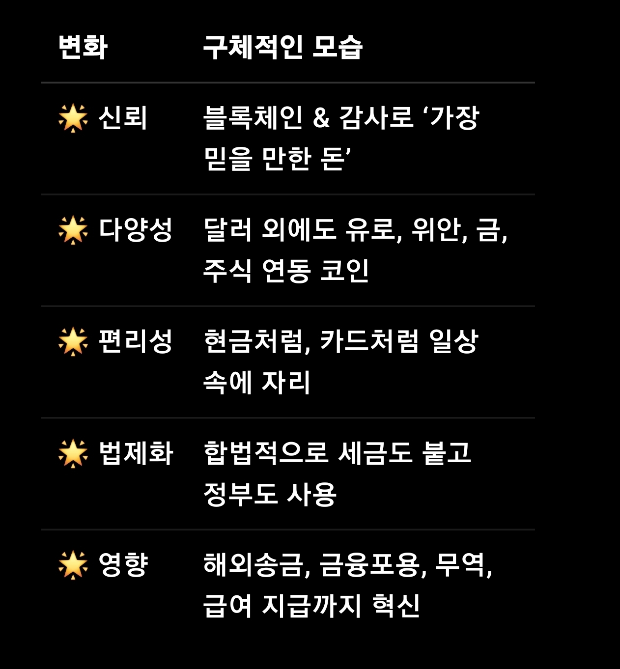 📌 결과: 사람들이 은행 계좌보다 더 믿고 쓸 수 있는 ‘디지털 현금’이 됨.