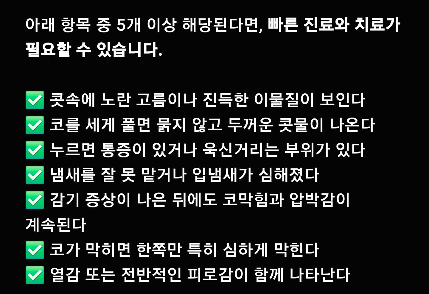 ✅ 콧속에 노란 고름이나 진득한 이물질이 보인다