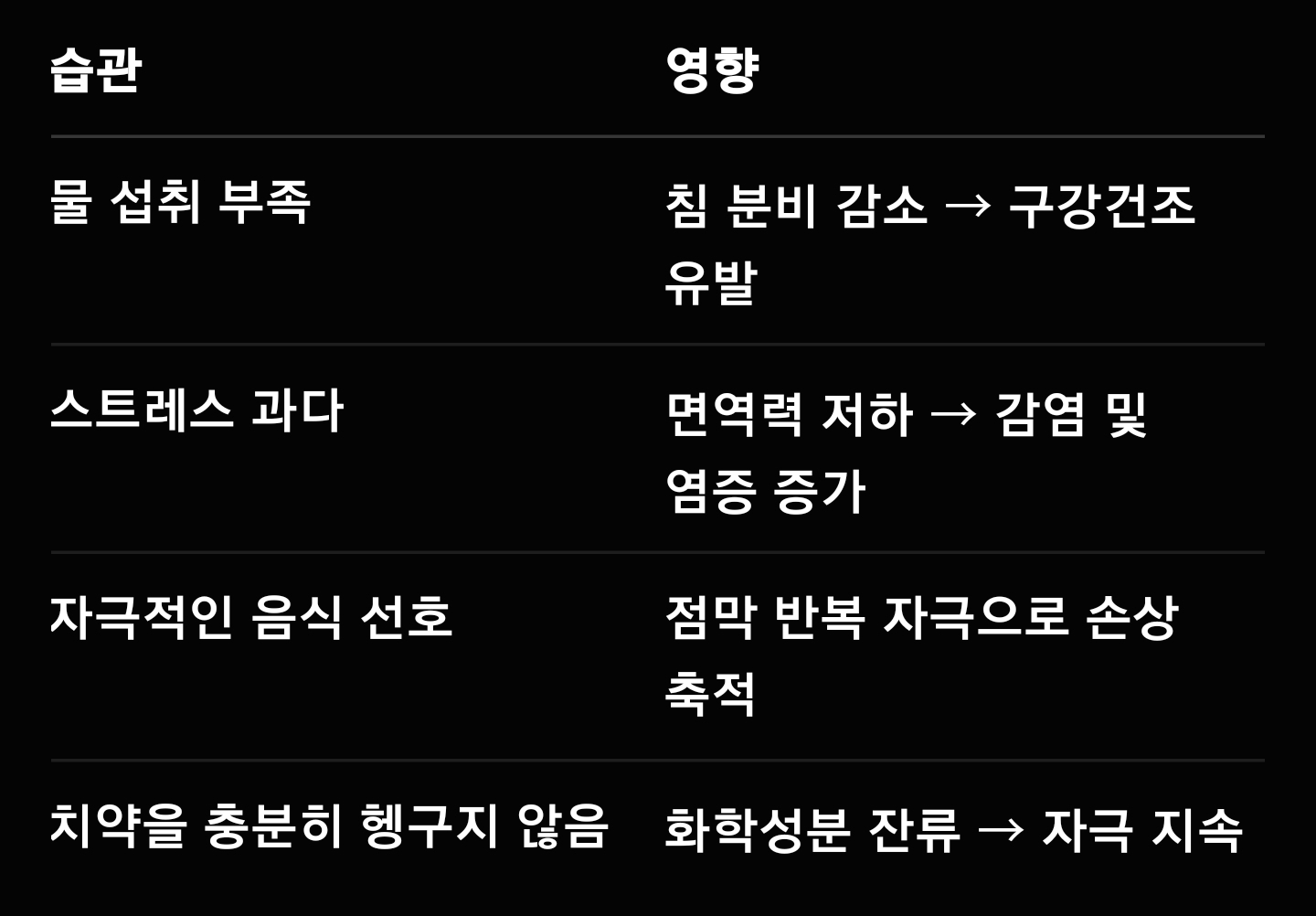너무 짜거나 매운 음식, 과도한 음주, 뜨거운 커피 등은 구강 점막을 반복적으로 자극합니다.
