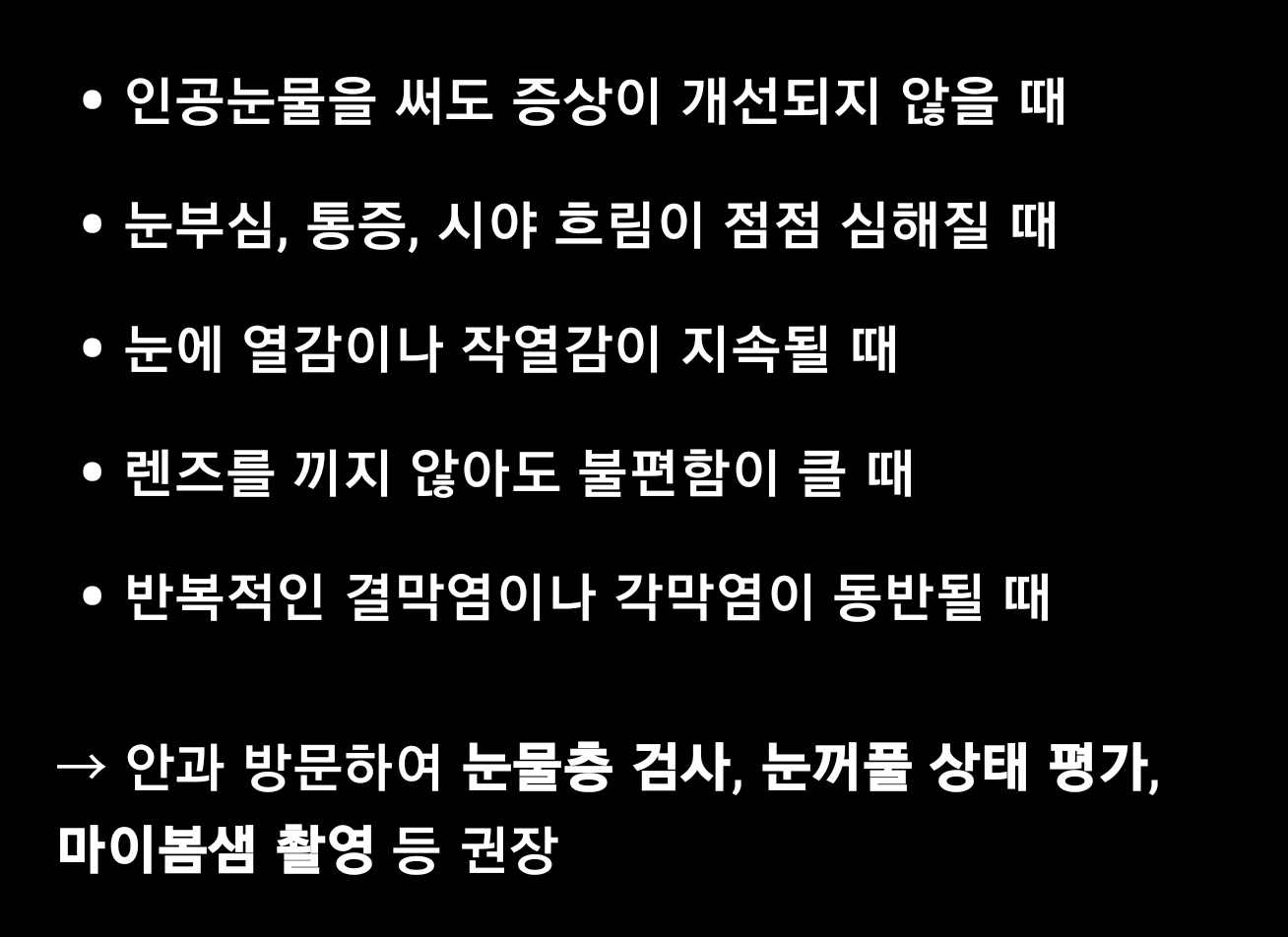 → 안과 방문하여 눈물층 검사, 눈꺼풀 상태 평가, 마이봄샘 촬영 등 권장