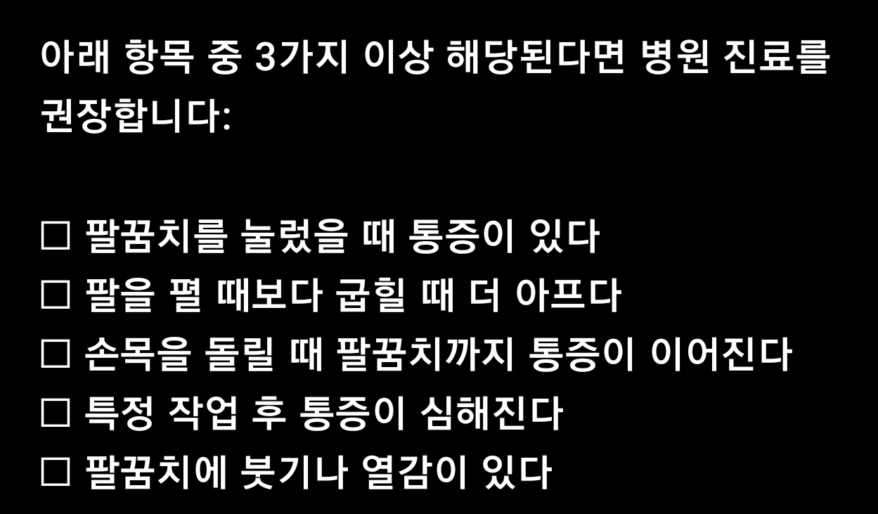 – 팔꿈치뿐 아니라 어깨, 손까지 이어지는 통증이 있을 수 있음