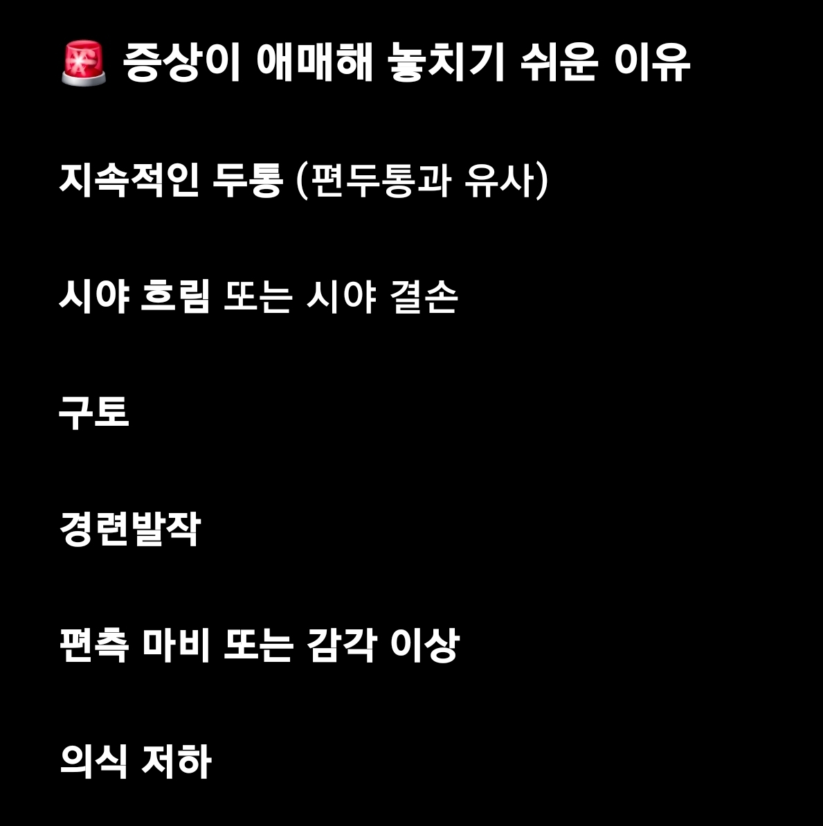 > ☑ 2개 이상 해당된다면, 반드시 신경과 또는 응급실 방문을 고려하세요.