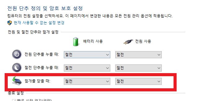 다른 버튼 말고 [덮개를 닫으면]이라는 문구가 쓰여있는 걸 누르셔야 합니다.