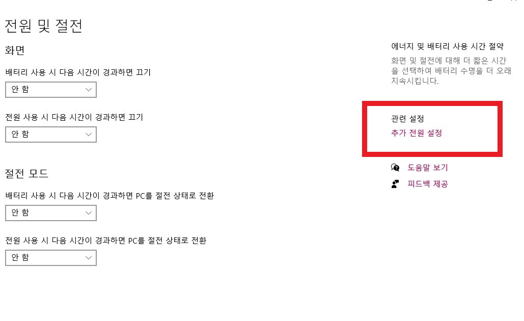 4. [전원 및 절전]을 누르시면 관련 설정 [추가 전원 설정]을 찾아서 눌러주세요.